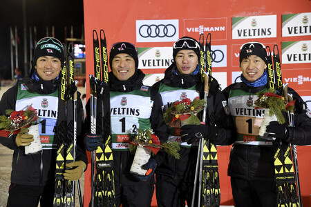 〔写真説明〕ノルディックスキーのワールドカップ団体で2位に入り、笑顔を見せる渡部暁斗選手(左端)と山元豪選手(右から2人目)=2018年11月、フィンランド・ルカ(Lehtikuva時事)