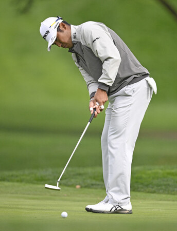 〔写真説明〕パットを打つ松山英樹=14日、米カリフォルニア州ペブルビーチ(AFP時事)