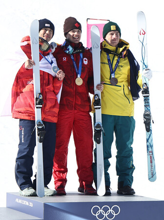 〔写真説明〕表彰台に立つフリースタイルスキー男子デュアルモーグルで銀メダルを獲得した堀島行真(左)。中央は優勝したカナダのキングズベリー=15日、リビーニョ