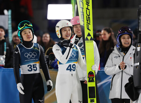 〔写真説明〕ノルディックスキー・ジャンプ女子個人ラージヒル、得点が発表されて笑顔を見せる丸山希(中央左)。右端は高梨沙羅=15日、プレダッツォ