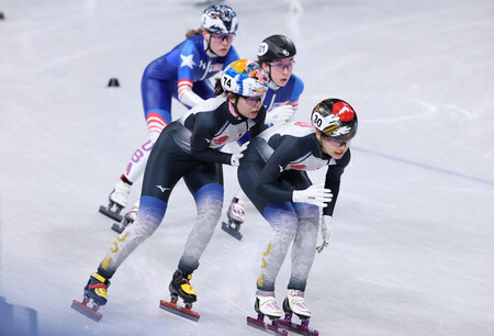 〔写真説明〕スピードスケート・ショートトラック女子3000メートルリレー順位決定戦で滑走する日本の選手ら=18日、ミラノ郊外