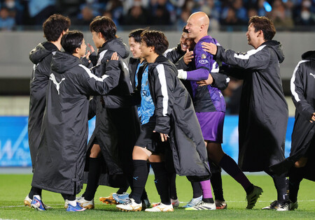 明治安田J1百年構想リーグは1日、各地で第4節の残り2試合が行われ、東は川崎が水戸を2―2からのPK戦で退け、勝ち点を7に伸ばした。 西は岡山が名古屋とのPK戦を制し、初勝利を挙げた。【時事通信社】 〔写真説明〕PK戦の末、水戸に勝ち、喜ぶGKのブローダーセン(右から2人目)ら川崎イレブン=1日、U等々力