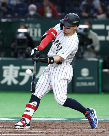 〔写真説明〕8回、適時二塁打を放つ日本代表の代打・佐藤=8日、東京ドーム