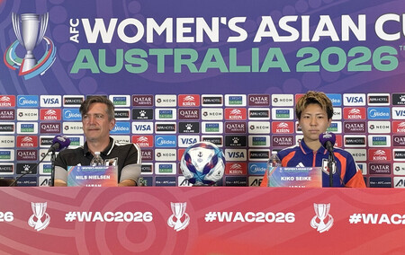 〔写真説明〕準々決勝に向けて記者会見する女子日本代表のニールセン監督(左)と清家=14日、シドニー