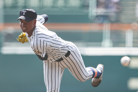 〔写真説明〕力投する帝京先発の仁礼=24日、甲子園