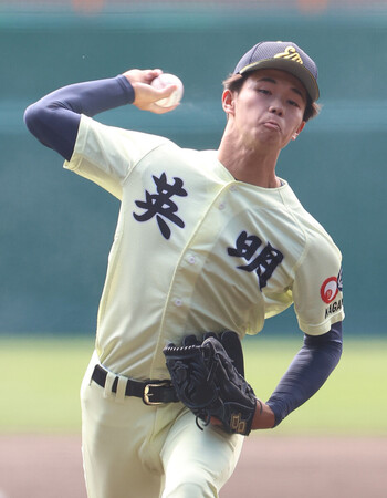 英明は追い付かれた直後の四回に前田、池田の連続適時打で2点を勝ち越し。六回は敵失に乗じ、太田の犠飛と松原の二塁打で3点を加えた。松本倫は3失点完投。巧みなけん制も光った。東北は松本のソロなど終盤の反撃も及ばなかった。【時事通信社】 〔写真説明〕力投する英明先発の松本倫=26日、甲子園