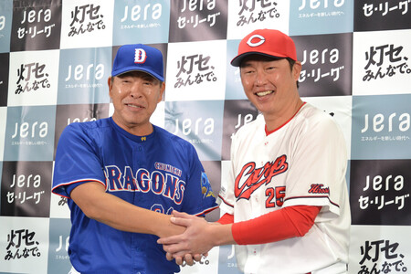 〔写真説明〕開幕戦を控え、握手する広島の新井監督(右)と中日の井上監督=26日、マツダスタジアム