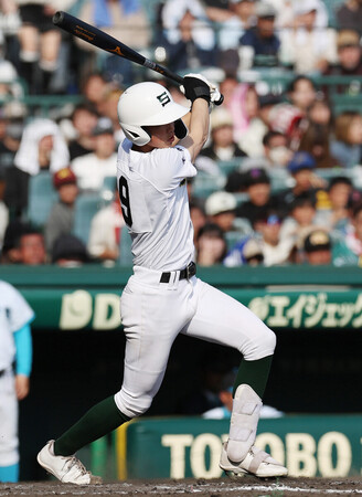 〔写真説明〕8回裏専大松戸1死二塁、瀬谷が勝ち越しの適時打を放つ=27日、甲子園