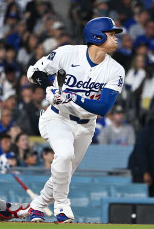 〔写真説明〕ガーディアンズ戦の1回、安打を放つドジャースの大谷=30日、ロサンゼルス