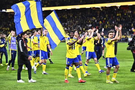 〔写真説明〕W杯出場を決め、喜ぶスウェーデンの選手ら=31日、ストックホルム近郊(EPA時事)