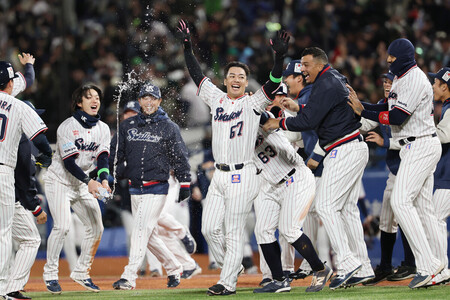 先発の奥川は五回2死まで1人の走者も許さなかった。先制された後も粘って7回1失点の好投で、「どんどん勝負にいった。こういう投球を続けていきたい」と手応えを得た。投打に収穫の多い劇的な勝利に、就任1年目の池山監督は「みんなよくやってくれた」と満足そうだった。