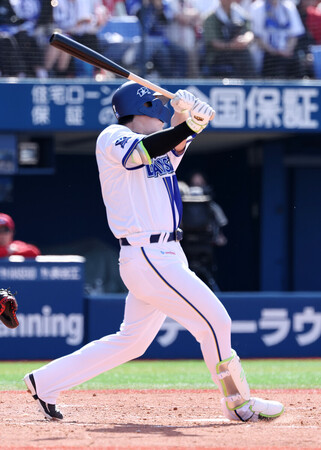 DeNAが1点を追う三回に集中打で逆転し、連敗を免れた。佐野、山本、京田の適時打など6安打で4得点。先発の東は7回3失点で2勝目。広島はターノックが5回持たず4失点で降板。七回に坂倉の2ランで追い上げたが、及ばなかった。【時事通信社】 〔写真説明〕3回、逆転の2点二塁打を放つDeNAの佐野=11日、横浜