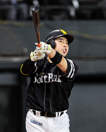 ソフトバンクが逆転勝ちした。0―1の四回に柳田のソロで追い付くと、六回に牧原大の右前打と柳町の犠飛、近藤の3ランで5点を奪った。上沢が7回2失点で今季初白星。日本ハムは先発の伊藤が踏ん張れず、3連勝はならなかった。【時事通信社】 〔写真説明〕6回、3ランを放つソフトバンクの近藤=11日、エスコンF