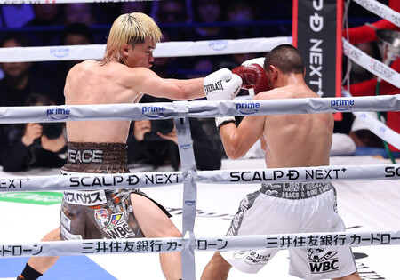 〔写真説明〕WBCバンタム級挑戦者決定戦の2回、エストラーダ(右)を攻める那須川天心=11日、東京・両国国技館