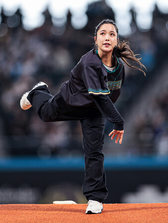 〔写真説明〕ファーストピッチセレモニーで投球する高梨沙羅=12日、エスコンF