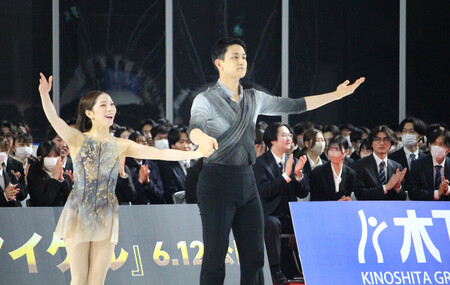 サプライズで登場すると、333人の新入社員から大きな歓声。三浦は「一つ一つの経験がこれからの自分をつくっていくと信じて、何事も楽しみながらチャレンジしてほしい」と話し、木原も「たくさんの失敗をして、多くを学んだ。皆さんも失敗を恐れずに挑戦して」と語った。2人は今季のフリー「グラディエーター」の後半部分を滑り、得意とする迫力のあるリフトを披露した。