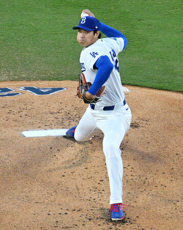 〔写真説明〕メッツ戦に先発登板し、力投するドジャースの大谷=15日、ロサンゼルス