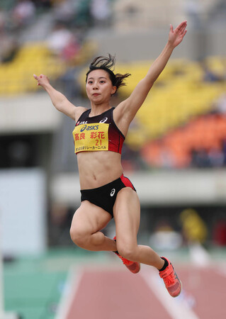 〔写真説明〕女子走り幅跳びで跳躍する高良彩花=19日、神戸ユニバー記念競技場
