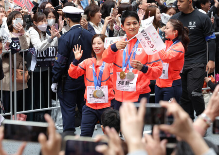 冬季大会後の日本選手団のパレード実施は初めて。スノーボード女子ビッグエアで金、スロープスタイルで銅の村瀬心椛(TOKIOインカラミ)は、ファンから直接声を掛けられ、「心にぐっとくるものがあった」。フィギュアスケート男子で銀の鍵山優真(オリエンタルバイオ)は「五輪が大きな舞台だったと肌で感じることができた」と充実感を浮かべた。