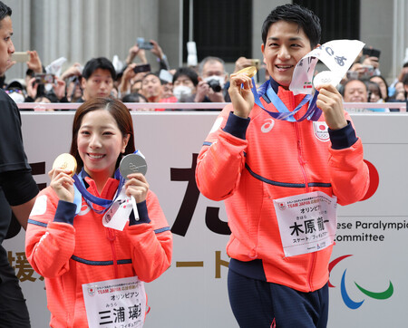 〔写真説明〕ミラノ・コルティナ冬季五輪・パラリンピックの応援感謝パレードで、メダルを披露するフィギュアスケート・ペアの三浦璃来さん(左)、木原龍一さん=25日、東京都中央区