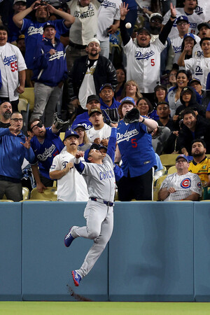 〔写真説明〕ドジャース戦の3回、フェンス際の打球を好捕するカブスの鈴木=24日、ロサンゼルス(AFP時事)