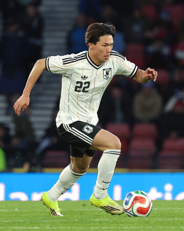 〔写真説明〕スコットランド戦でドリブルする塩貝健人=3月、英国・グラスゴー