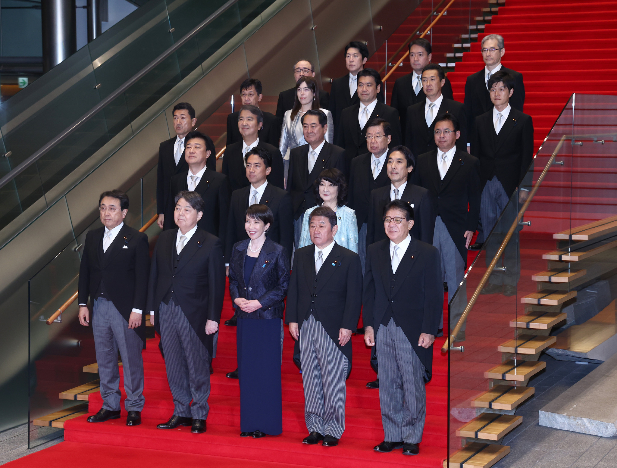 初閣議を終え、記念撮影する高市早苗首相(前列中央)と閣僚ら=21日午後、首相官邸