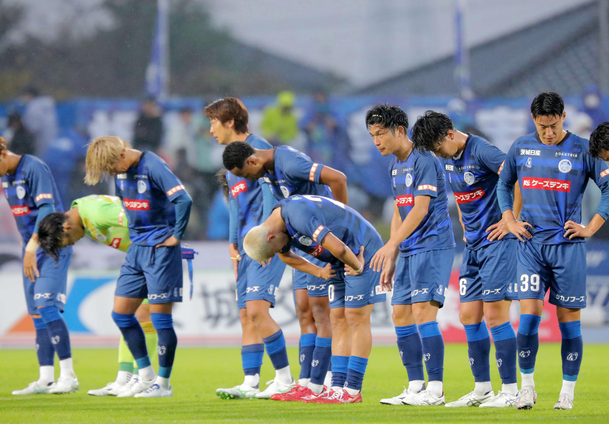 明治安田J2リーグは9日、各地で第36節の8試合が行われ、首位の水戸は大宮に0―2で敗れた。勝ち点67のままで、初のJ1昇格決定は持ち越しとなった。写真は肩を落とす水戸の選手=同日、Ksスタ