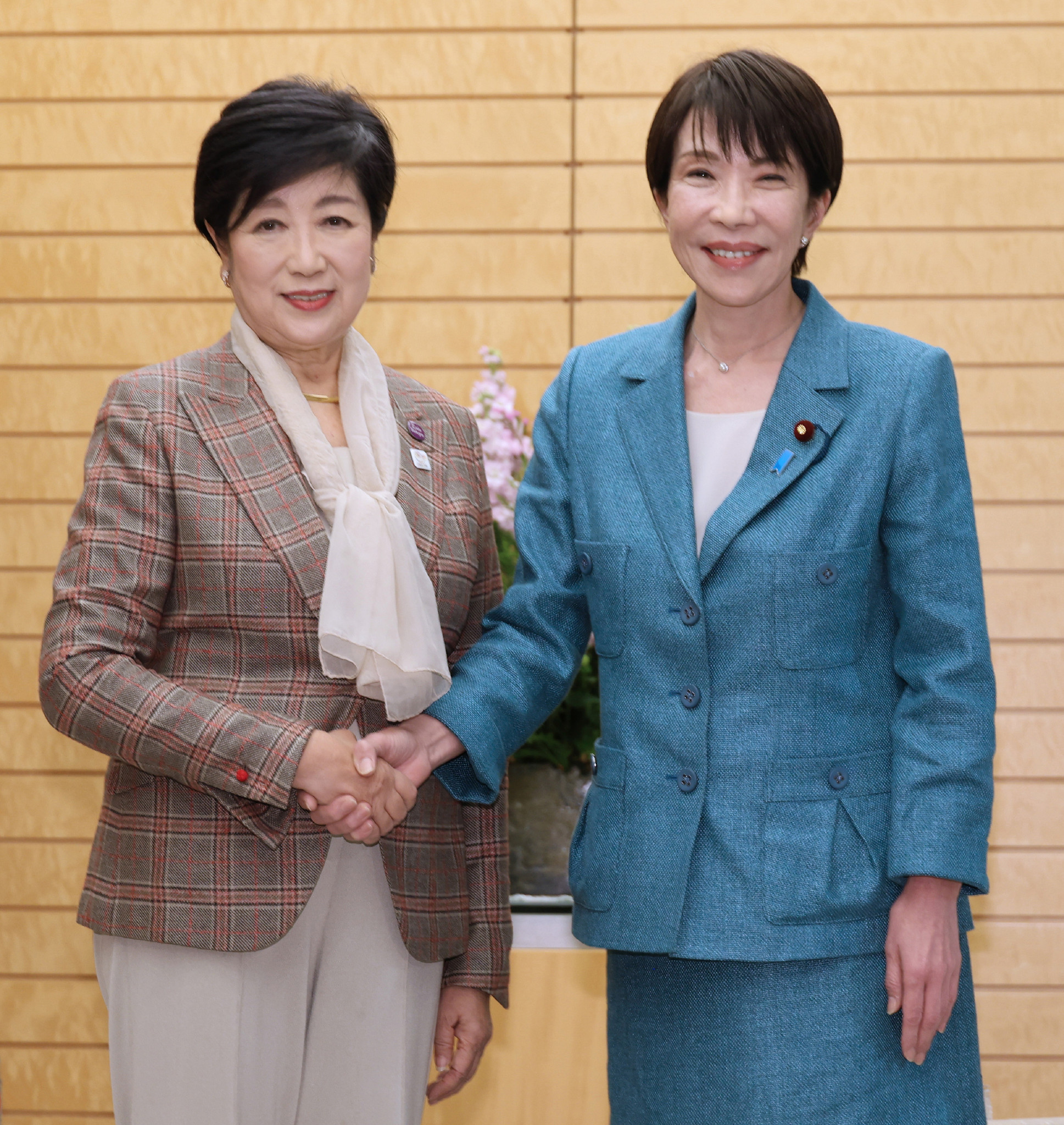 高市早苗首相(右)は19日、首相官邸で東京都の小池百合子知事と会談した。小池氏との会談は首相就任後、初めて。少子化対策や子育て支援策などについて意見交換した。