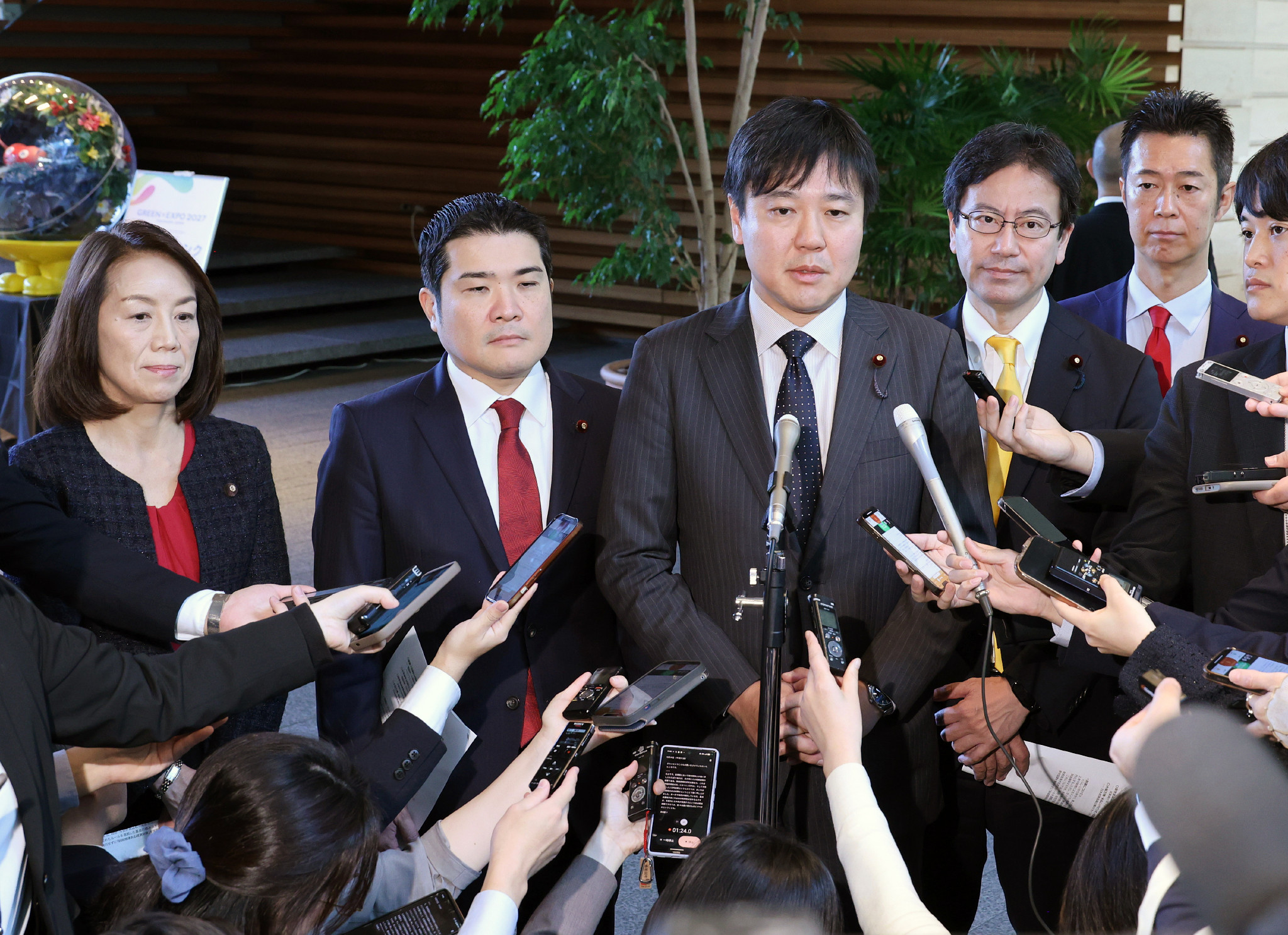 木原稔官房長官に経済対策に関する申し入れを行った後、記者団の取材に応じる立憲民主党の本庄知史政調会長(左から3人目)ら=19日、首相官邸