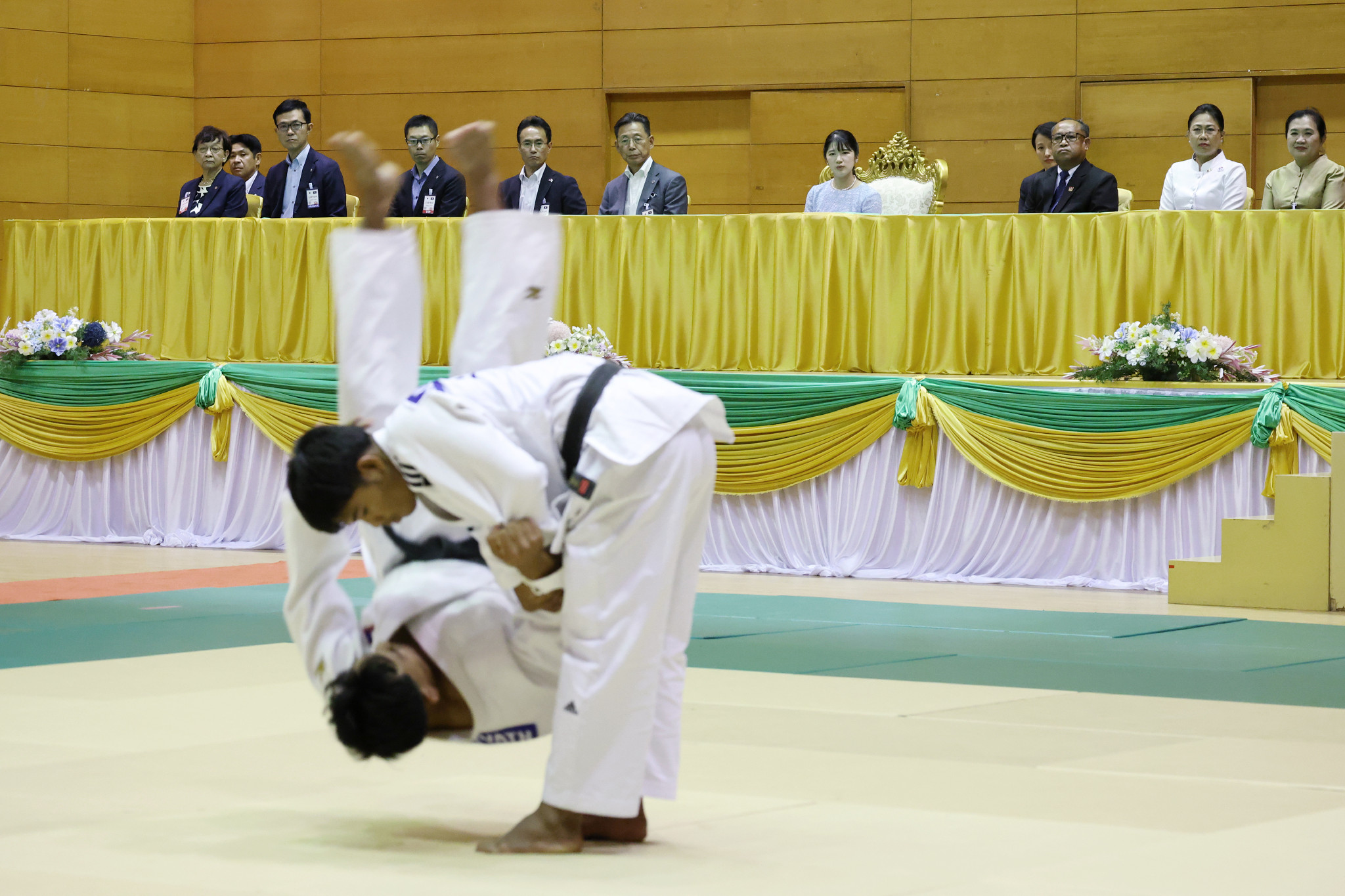 日・ラオス武道センターで演武を見学される天皇、皇后両陛下の長女愛子さま=19日午後、ビエンチャン