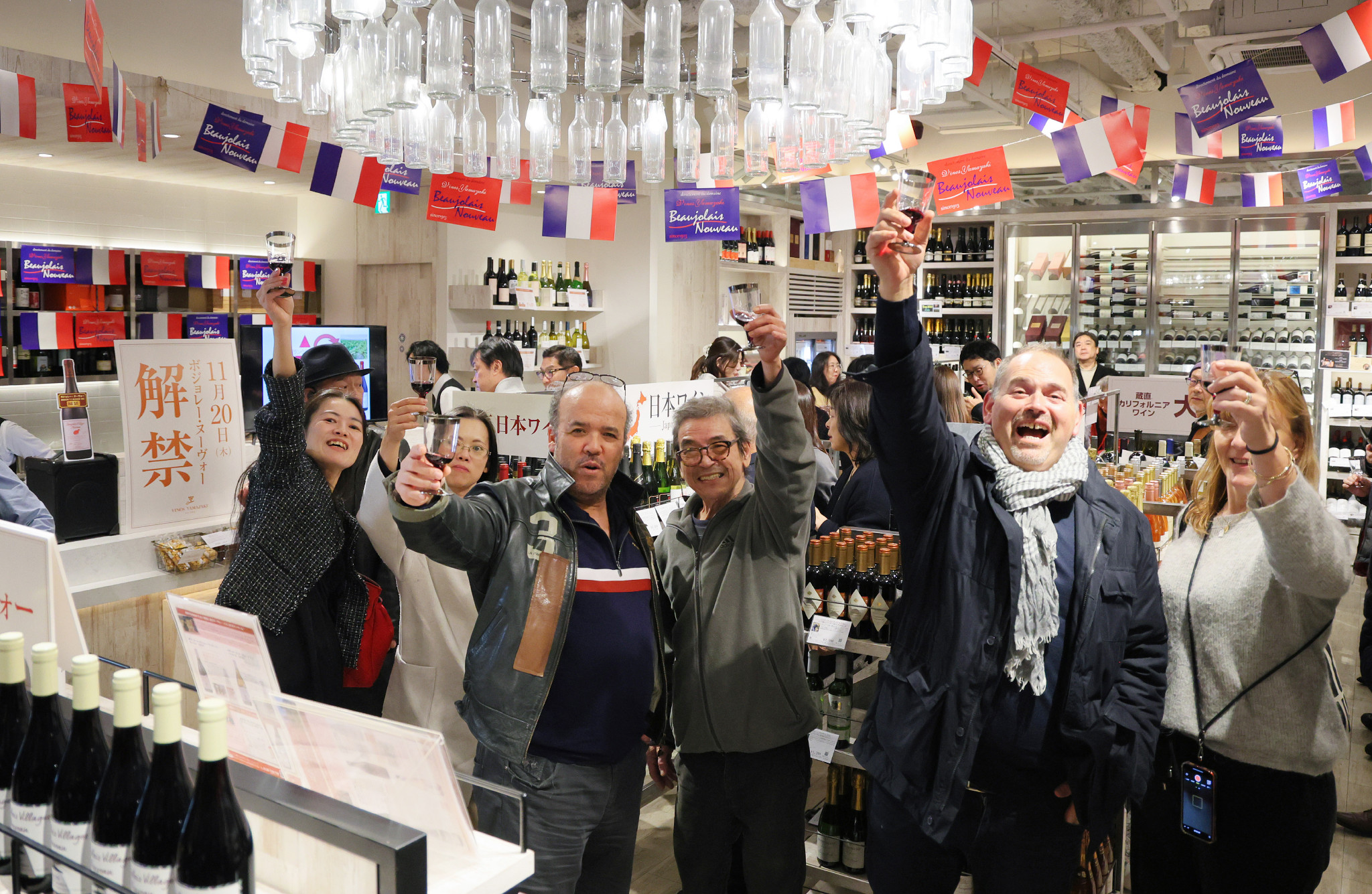 フランス・ブルゴーニュ産ワインの新酒「ボージョレ・ヌーボー」が20日午前0時に解禁された。ボージョレの輸入は減少傾向が続くが、多くの愛好者が秋の風物詩に酔いしれた=東京都中央区