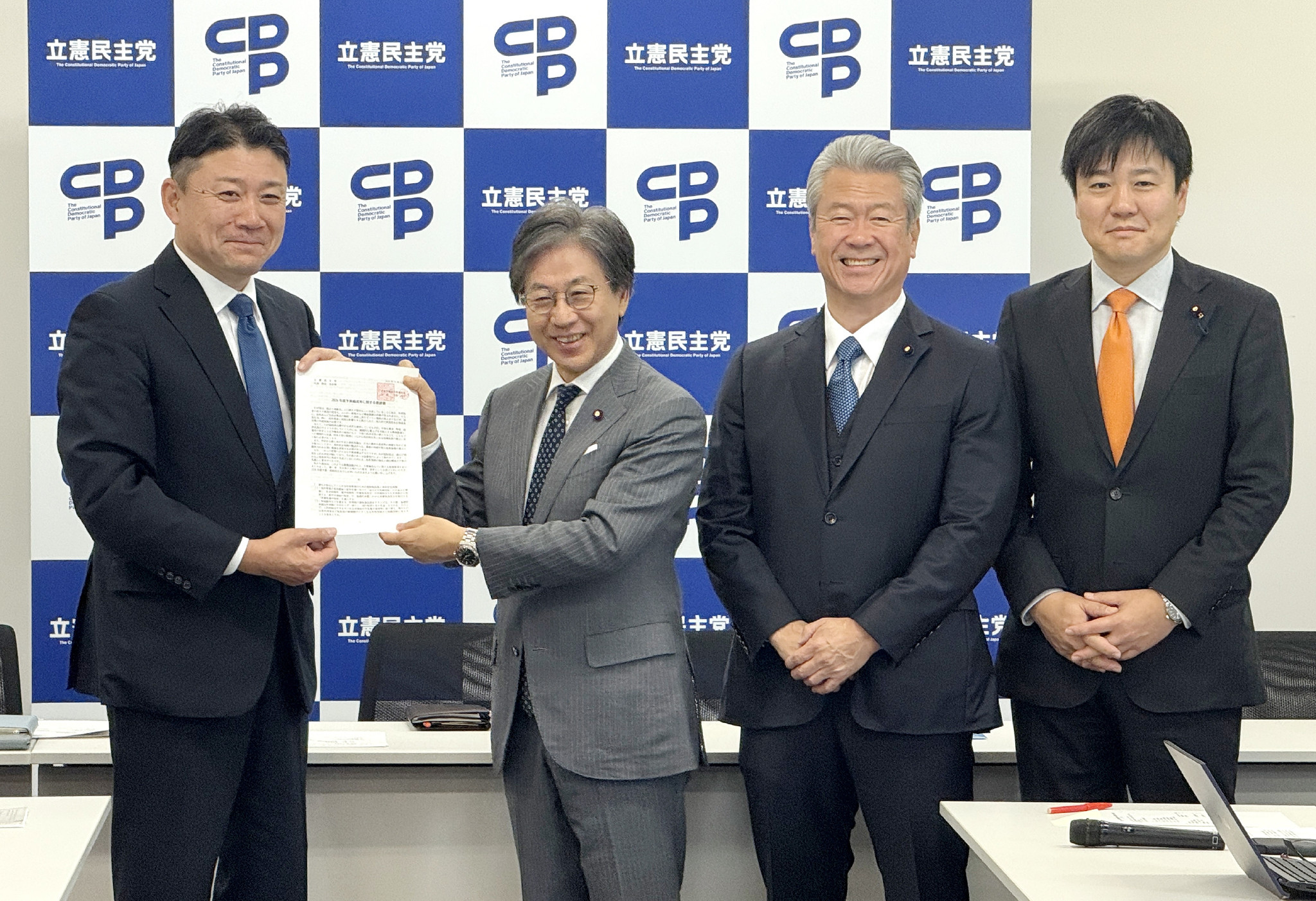 連合の神保政史事務局長(左端)から要請書を受け取る立憲民主党の安住淳幹事長(中央左)=21日午前、国会内