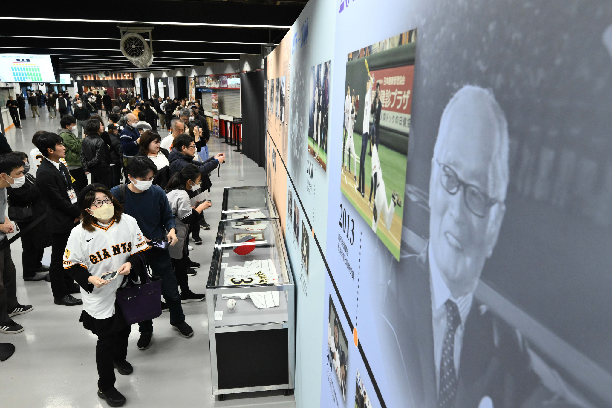 長嶋茂雄さんのお別れの会で、展示されたゆかりの品を見る参列者=21日午前、東京都文京区(代表撮影)