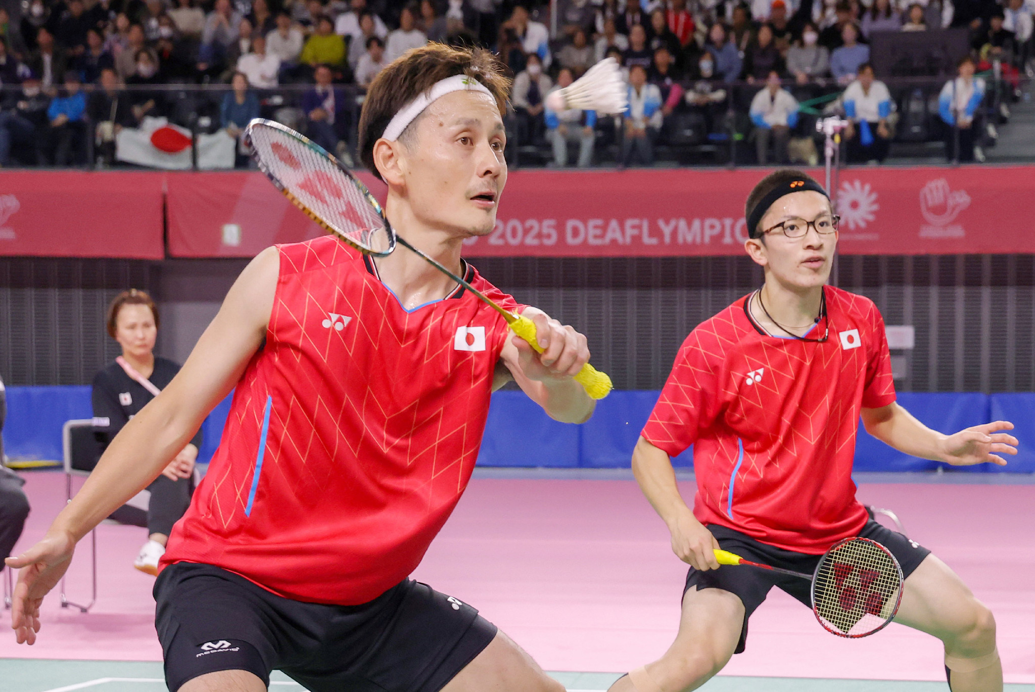 バドミントン男子ダブルス決勝でプレーする森本悠生(右)、永石泰寛組=21日、京王アリーナ東京