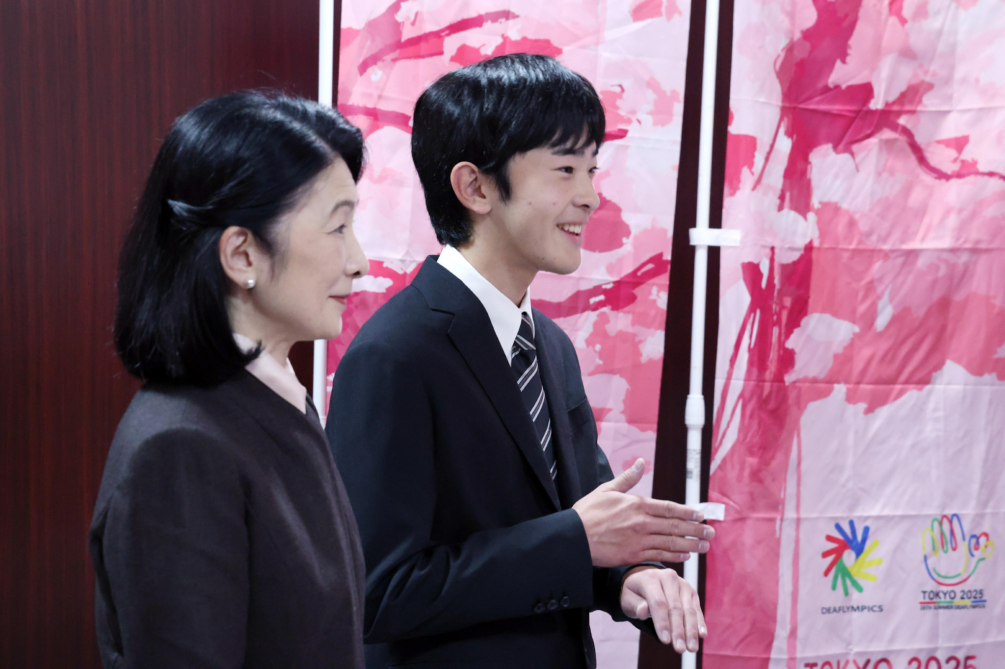 オリエンテーリング選手団と手話で会話される秋篠宮ご夫妻の長男悠仁さまと、秋篠宮妃紀子さま=22日午後、東京都大島町(代表撮影)