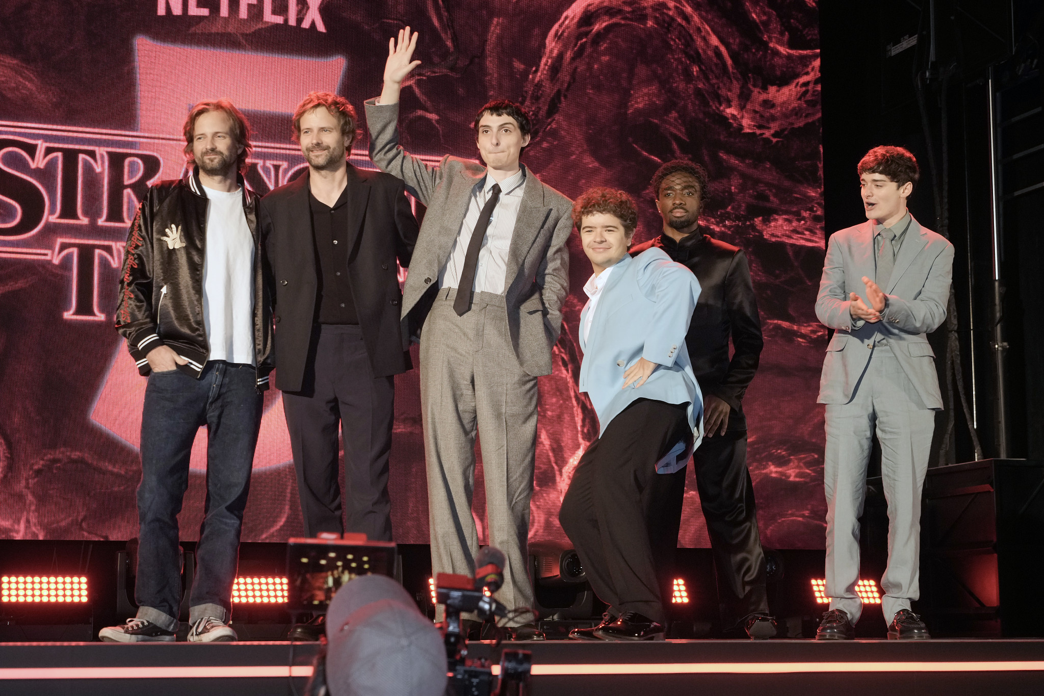 Netflix「ストレンジャー・シングス未知の世界5」のファンフェスタに登壇した監督のダファー兄弟、フィン・ヴォルフハルト、ゲイテン・マタラッツォ、ケイレブ・マクラフリン、ノア・シュナップ=22日【時事通信フォト】