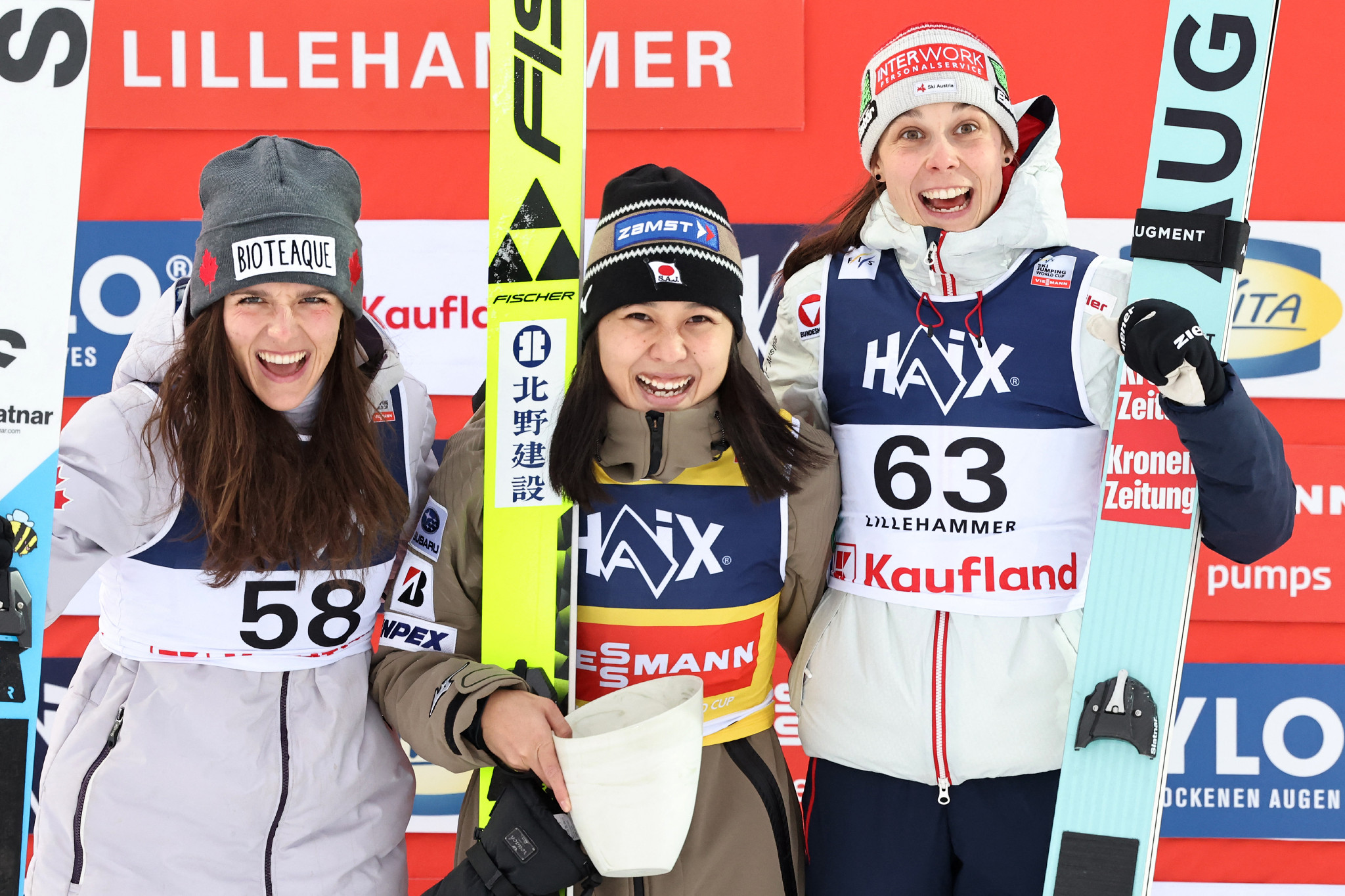 ノルディックスキーのワールドカップ(W杯)ジャンプ女子個人第1戦で優勝した丸山希(中央)=22日、ノルウェー・リレハンメル