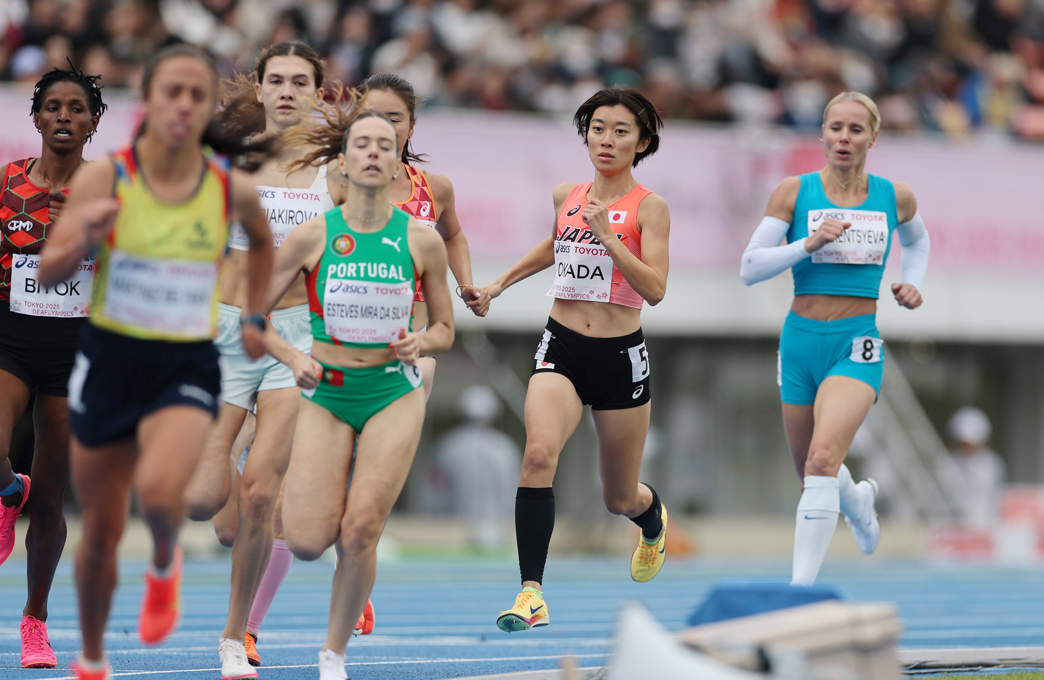 陸上女子800メートル決勝で力走する岡田海緒(右から2人目)=23日、東京・駒沢陸上競技場