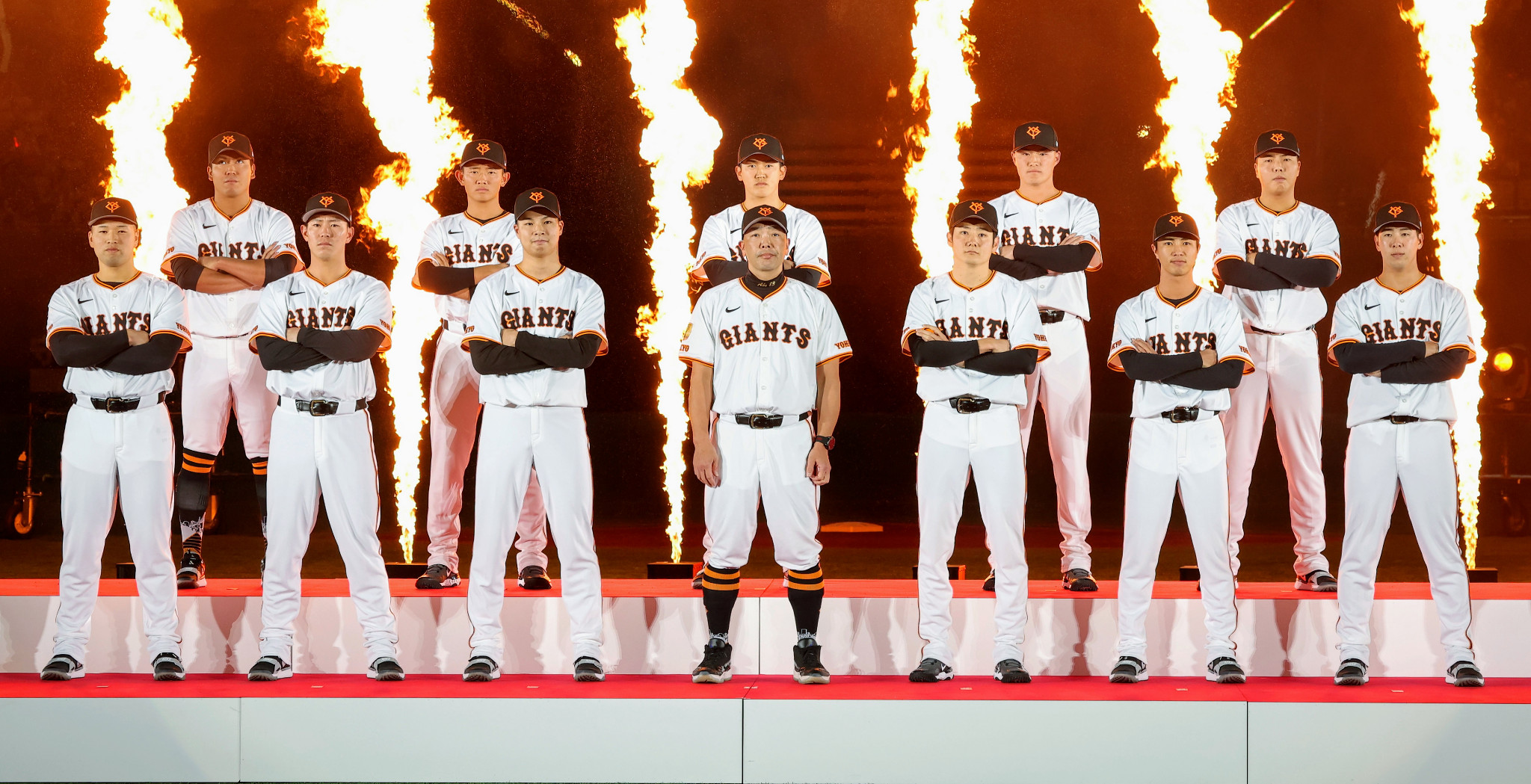 巨人の阿部慎之助監督(前列中央)と写真に納まる新入団選手=23日、東京ドーム