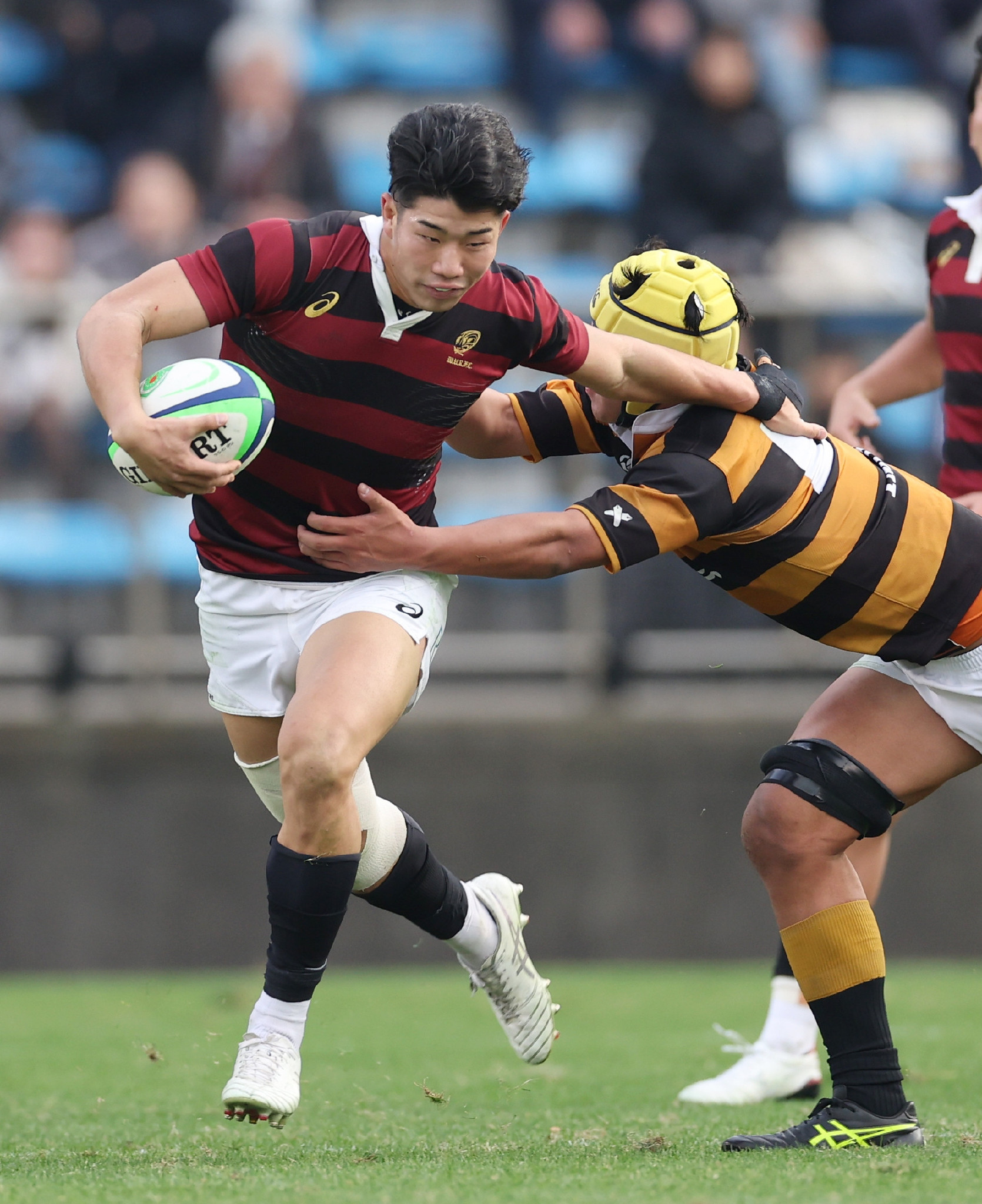 早大―慶大。前半、突進する早大の矢崎(左)=23日、東京・秩父宮ラグビー場