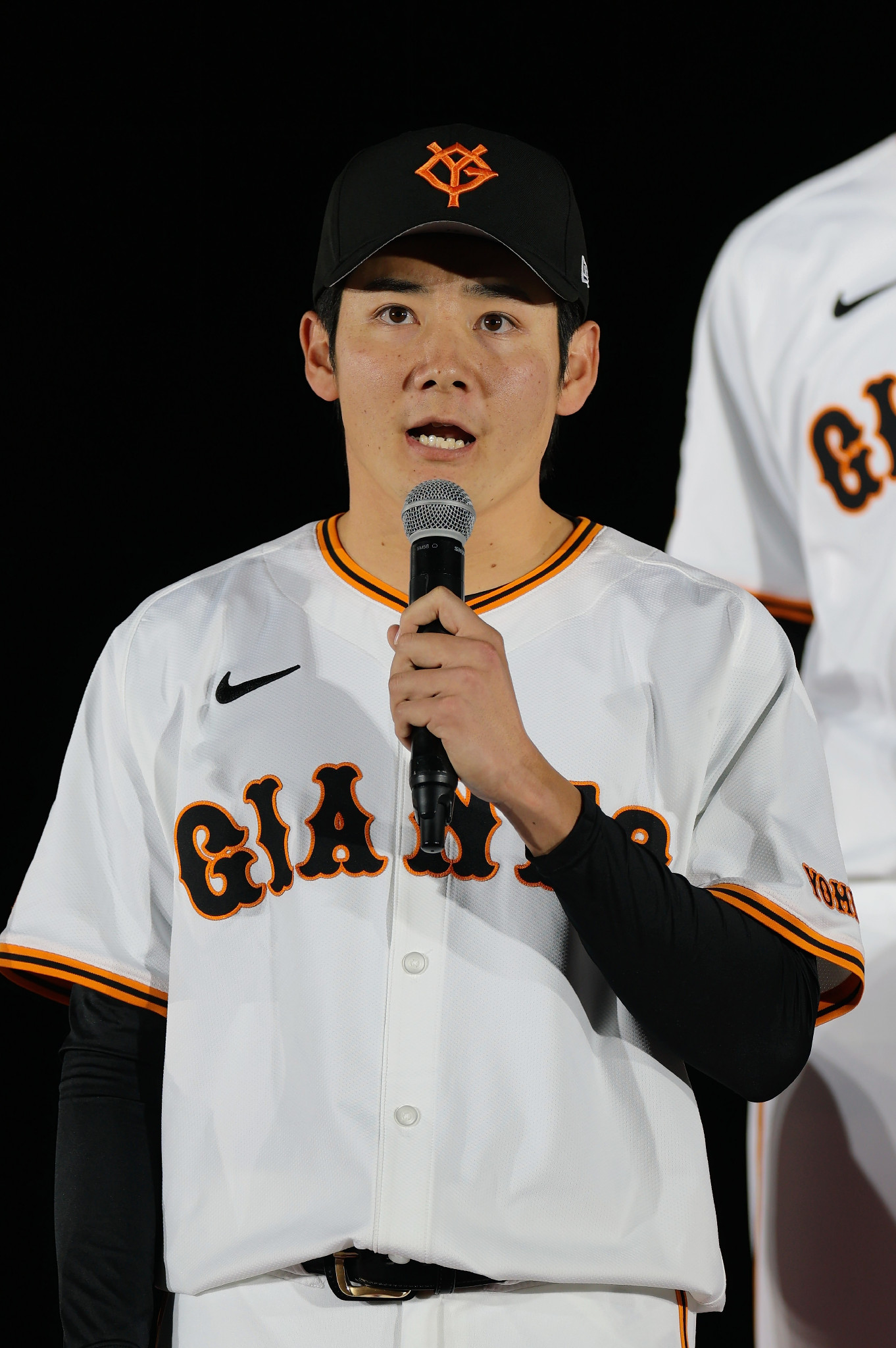巨人の新入団発表で、あいさつするドラフト1位の竹丸和幸投手=23日、東京ドーム
