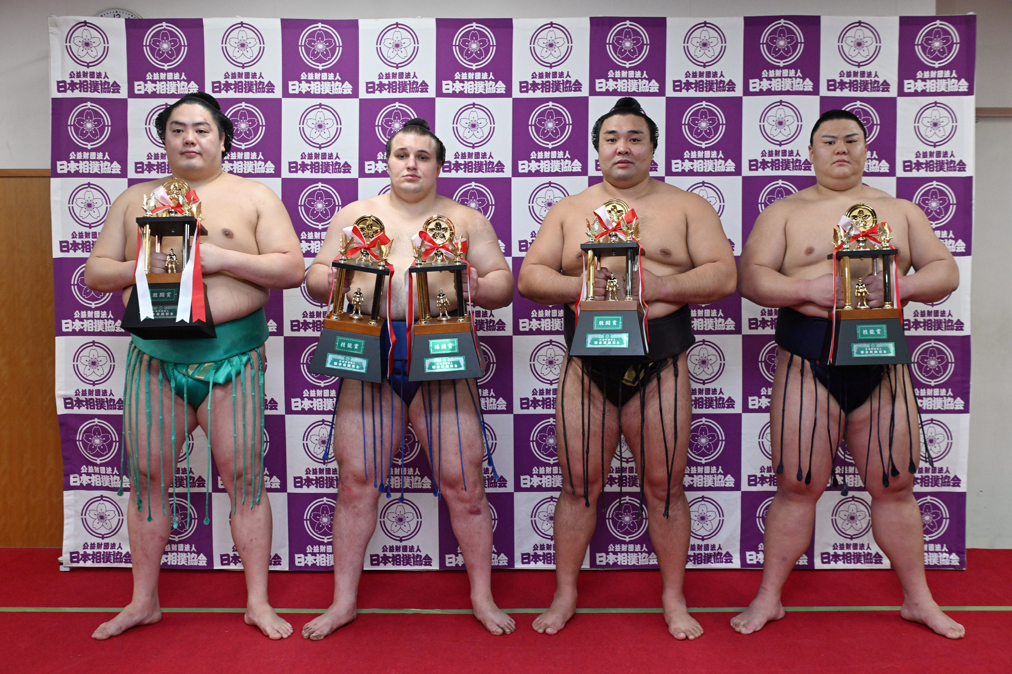 大相撲九州場所千秋楽。三賞受賞の力士。(左から)敢闘賞の一山本、殊勲賞・技能賞の安青錦、敢闘賞の霧島、技能賞の義ノ富士=23日、福岡国際センター