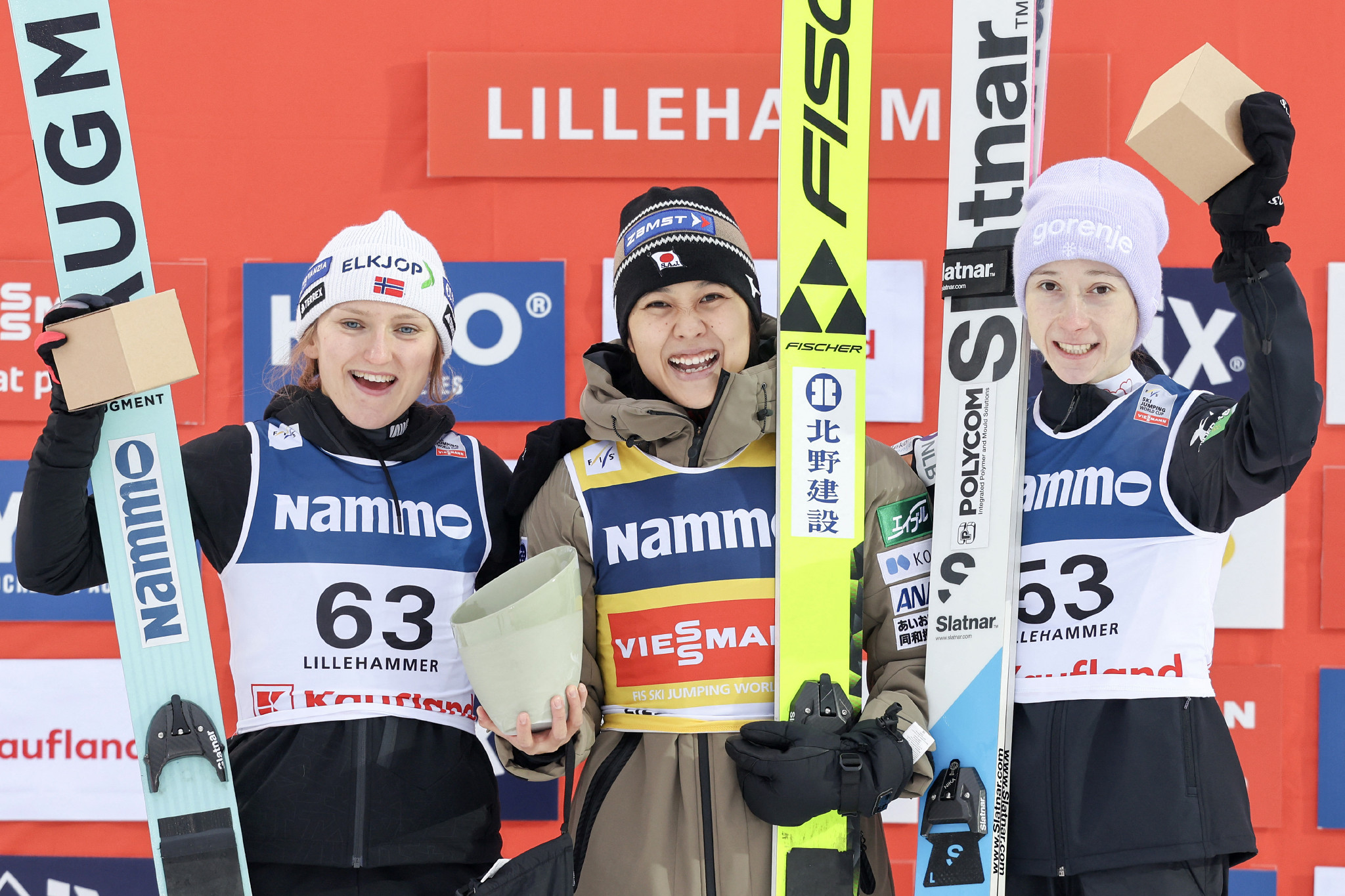 ノルディックスキーのワールドカップ・ジャンプ女子。個人第2戦が行われ、丸山希(中央)が134メートルと133メートルを飛び、合計283.6点で圧勝した。開幕2連勝=23日、ノルウェー・リレハンメル【AFP時事】