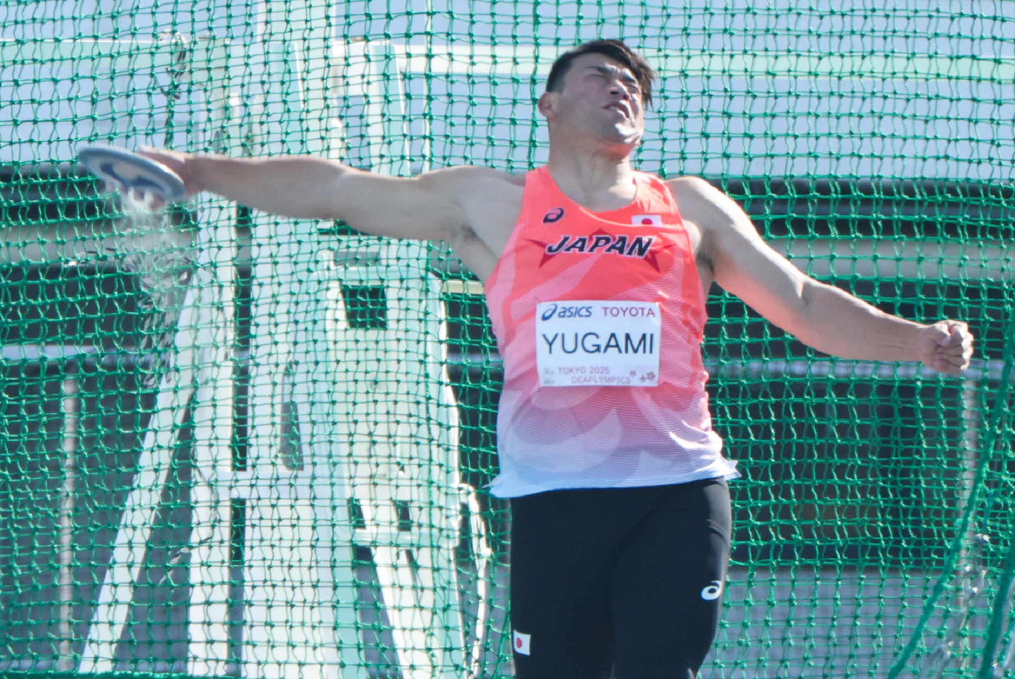 陸上男子円盤投げ決勝、投てきする湯上剛輝=24日、東京・駒沢陸上競技場