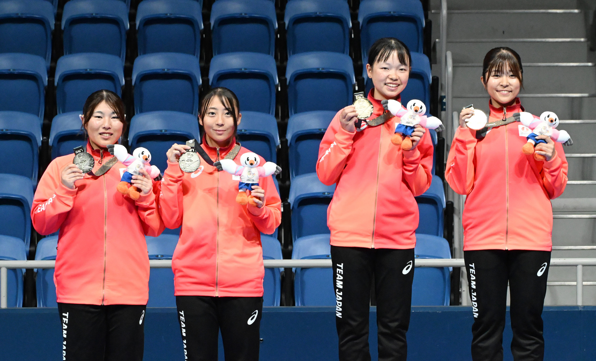 テニス女子ダブルスで表彰台に乗った日本勢。(右から)金メダルの菰方里菜、鈴木梨子、銀メダルの杉本千明、宮川百合亜=24日、東京・有明コロシアム