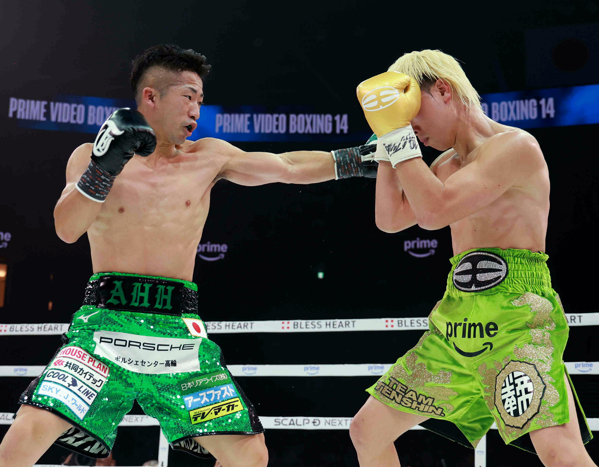 WBCバンタム級王座決定戦の3回、那須川天心(右)を攻める井上拓真=24日、トヨタアリーナ東京