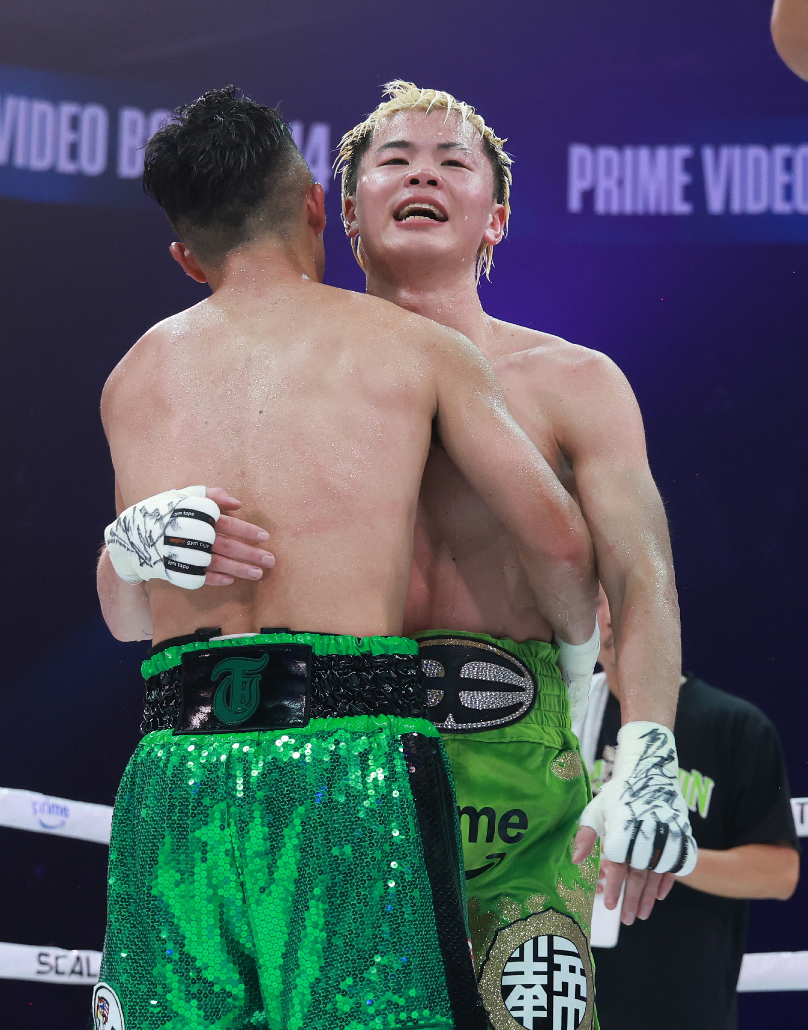 WBCバンタム級王座決定戦で敗れ、井上拓真(左)をたたえる那須川天心=24日、トヨタアリーナ東京