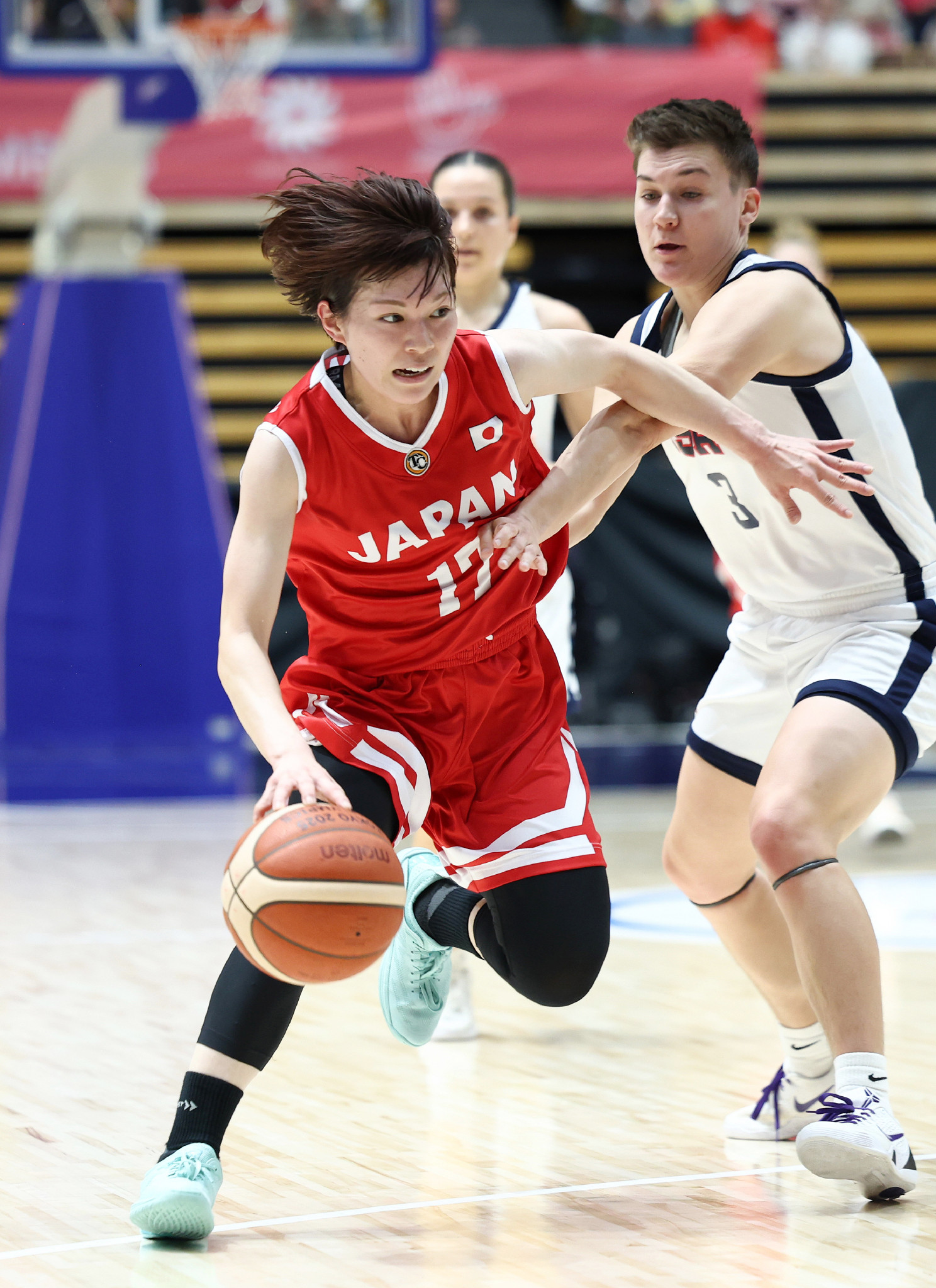 バスケットボール女子決勝、米国戦で攻め込む若松(左)=25日、東京・大田区総合体育館
