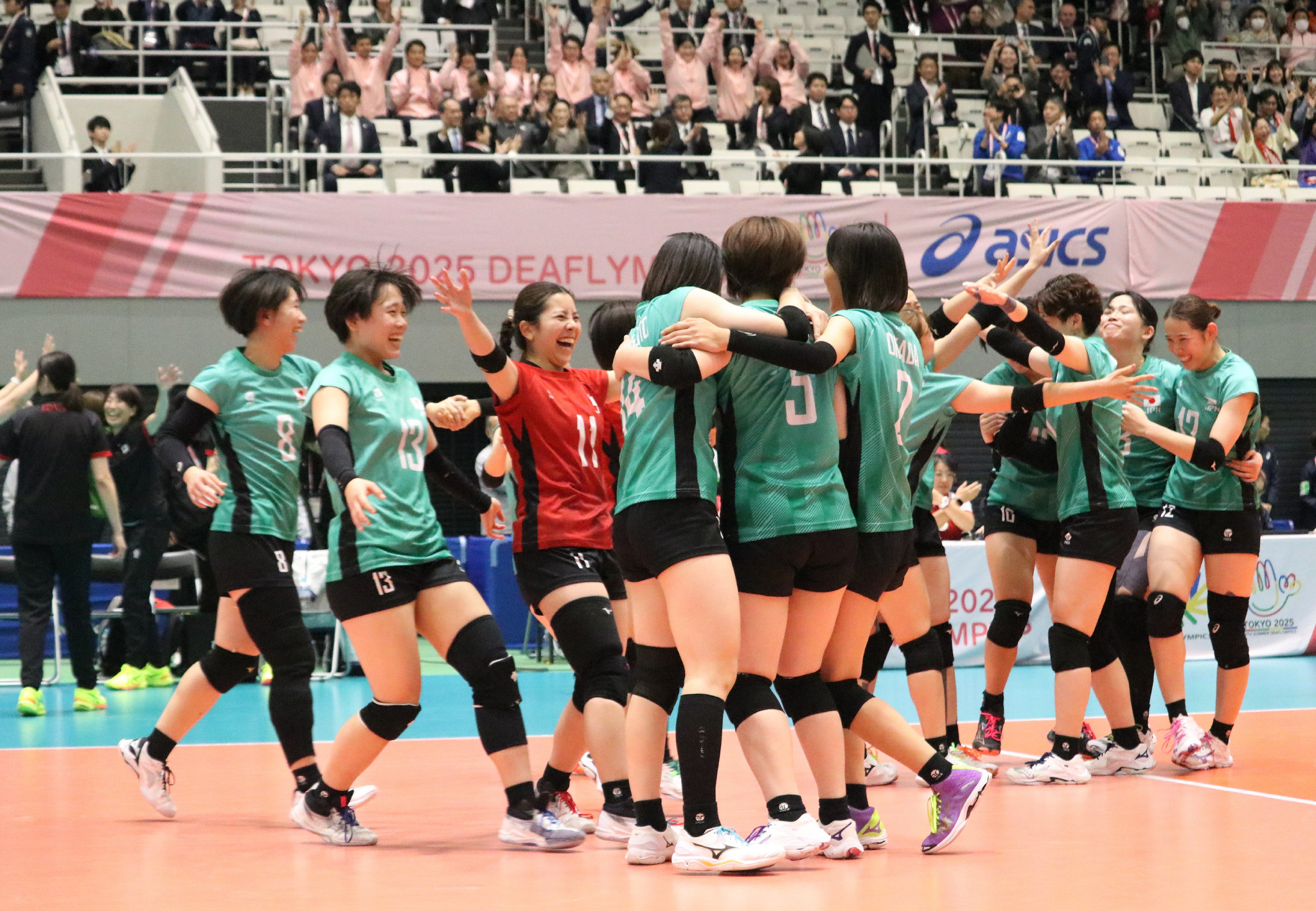 バレーボール女子決勝でトルコを下し、喜ぶ日本の選手たち=25日、東京・駒沢体育館